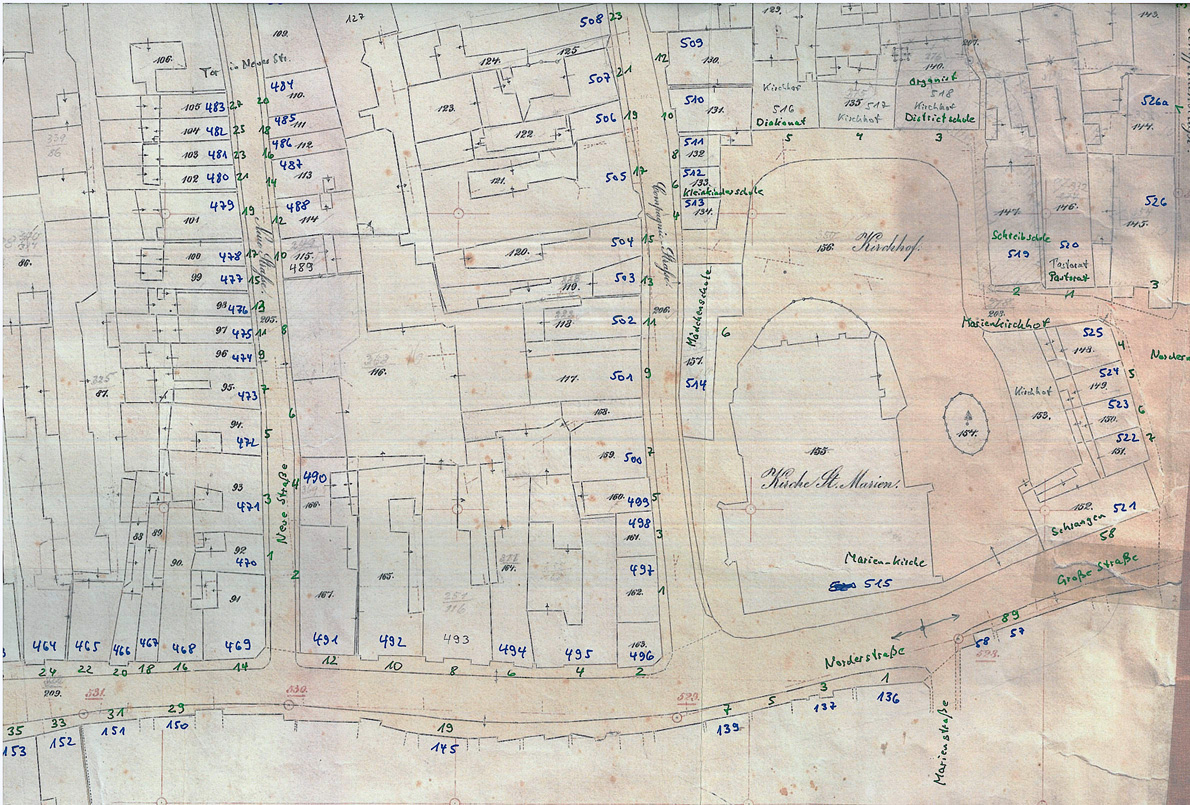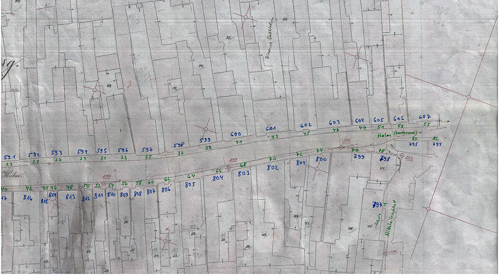 ![]() Bild: Flurkarte Ausschnitt von 1876 (grün = Hausnummern ab 1881, blau = Hausnummern 1876); Achtung: 1845 wieder andere Hausnummern! |